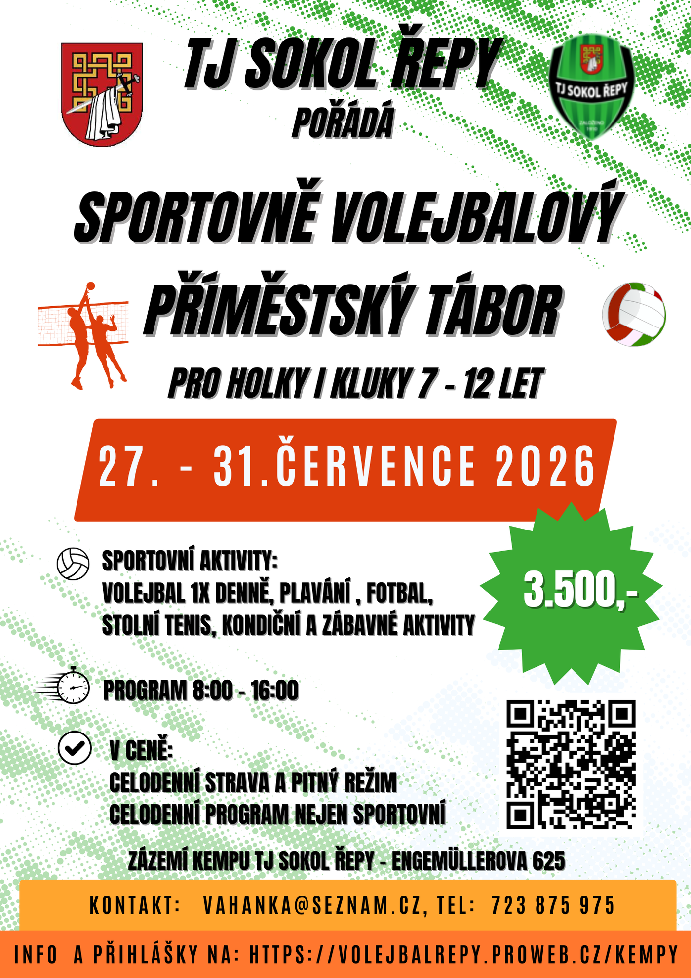 V termínu 27. - 31. července 2026 pořádáme v zázemí TJ Sokol Řepy sportovně volejbalový příměstský tábor pro dívky a chlapce ve věku 7-12 let.
